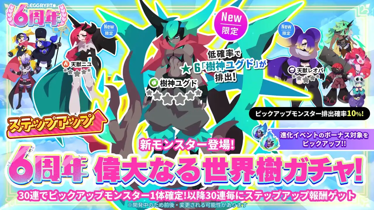 期間中、新モンスターが3体追加された「6周年偉大なる世界樹ガチャ」を開催します。6周年を記念して★6ガチャモンスターが初めて登場します。ぜひ手に入れてみてください。詳しくはゲーム内のお知らせをご確認ください。 |