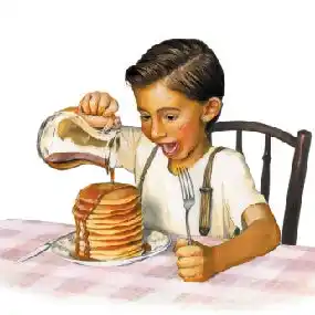 大人たちは背広のポケットからウイスキーを取り出し、メー プル坊やは真似をしてメープルシロップを忍ばせました。 誰もいない合間をねらって、キッチンの戸棚からメープルのシロップをこっそり取ってはポケットに入れて、愛犬との散歩の時間や、裏庭の木に登ってペロリ。 |