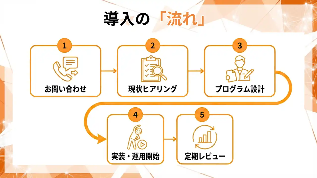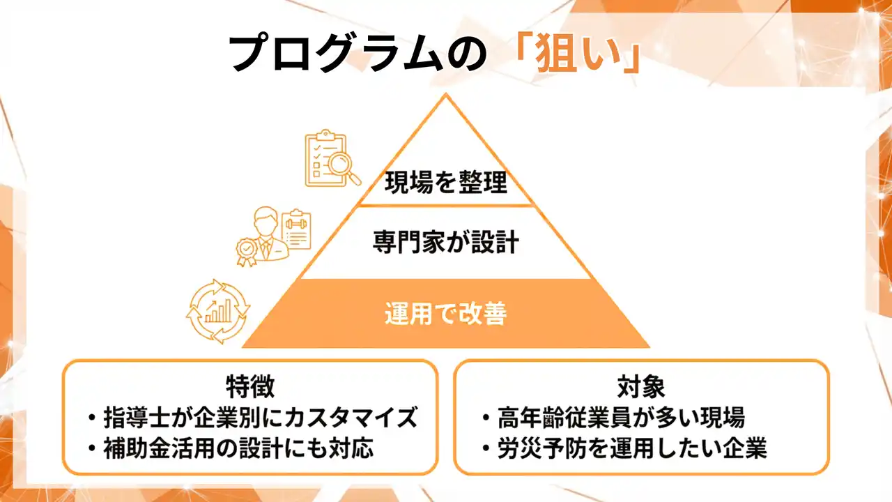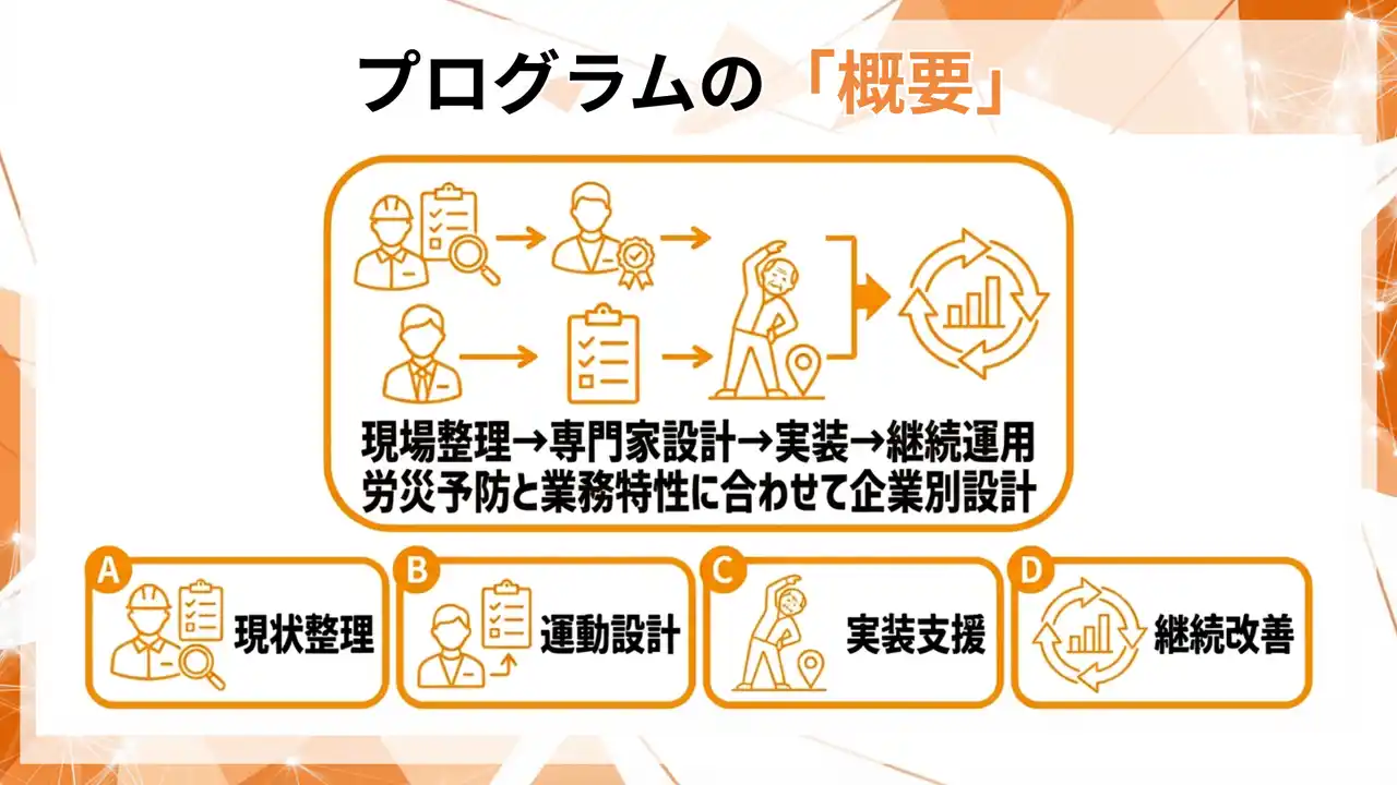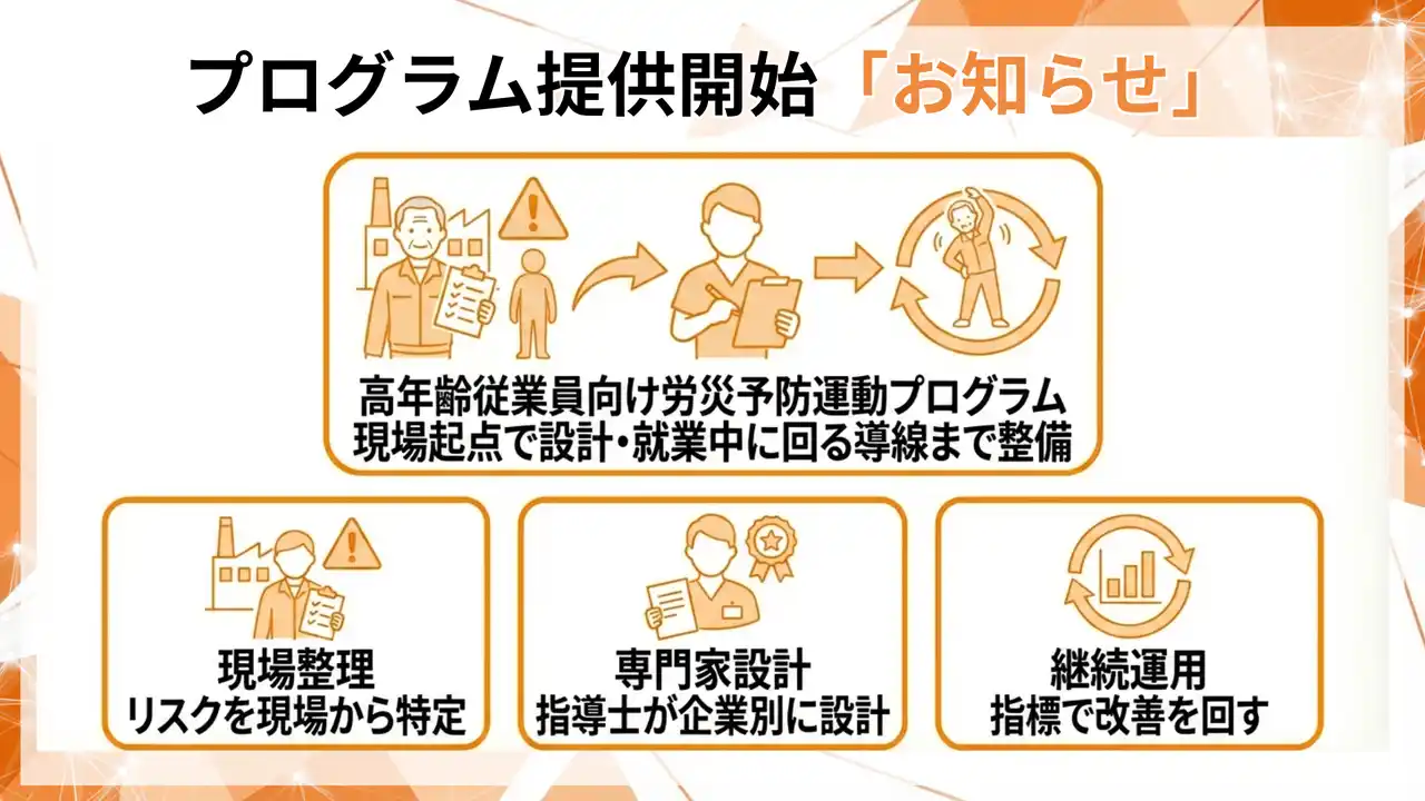 本プログラムは、単なる健康増進ではなく、労災予防(転倒・腰痛等)と身体負担軽減に結びつく形で運動指導を設計し、職場で回る運用まで整備します。 |