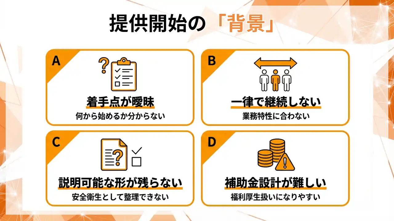 安全衛生の取り組みとして説明可能な形(目的、専門家関与、継続性、効果検証)が残らない |