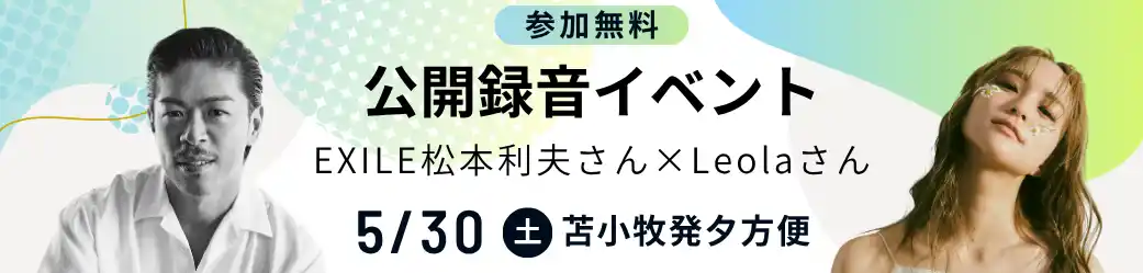 本イベントでは、パーソナリティのEXILE松本利夫さん、ゲストにLDH所属アーティストのLeolaさんをお招きし、公開録音を実施します。また、公開録音では、Leolaさんによるスペシャルミニライブも予定しており、船旅ならではの特別な体験をお楽しみいただけます。 |