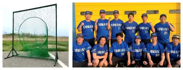 ※写真は寄贈する打撃用ティーネット(写真左)とコマニーソフトボール部(写真右)