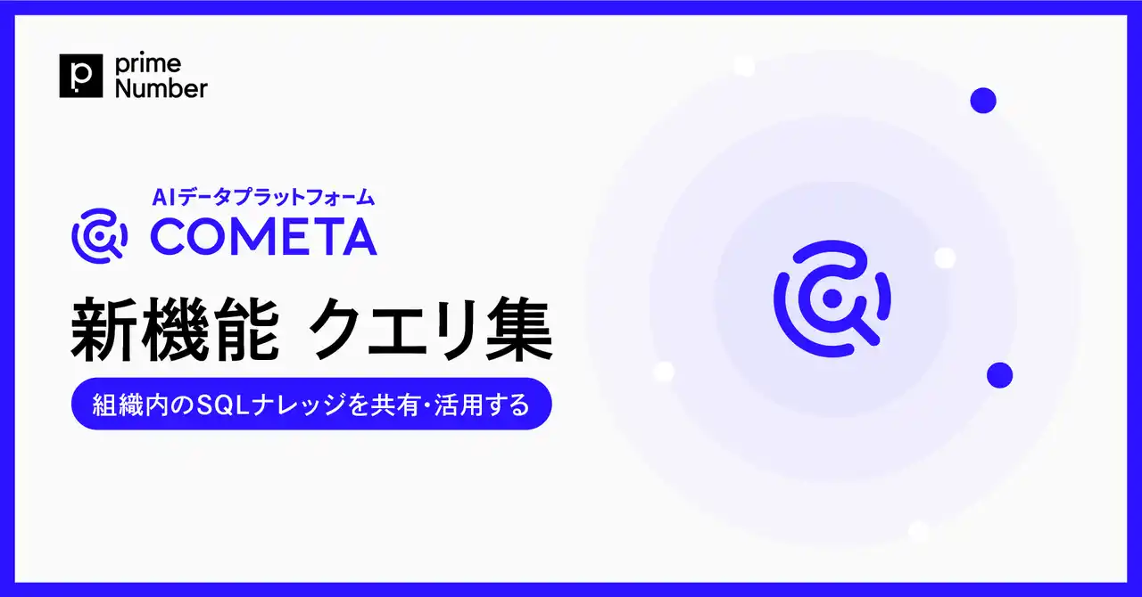 株式会社primeNumber(本社:東京都品川区、代表取締役CEO 田邊 雄樹)は、AIデータプラットフォーム「COMETA」において、新機能「クエリ集」を2026年4月17日に正式リリースしました。クエリ集は、実務で検証済みのSQLを組織で蓄積・共有し、AIチャットがそれを参照してデータ分析を行う機能です。これにより、AIが組織固有のロジックを踏まえた精度の高い分析を実現するとともに、誰でも実績のあるSQLをすぐに探して活用することが可能となります。primeNumberは本機能を通じて組織に眠るSQLナレッジを人やAIが活用できる資産へと変え、データ分析の速度と信頼性を高めます。 |