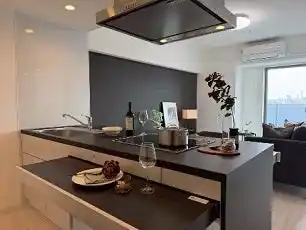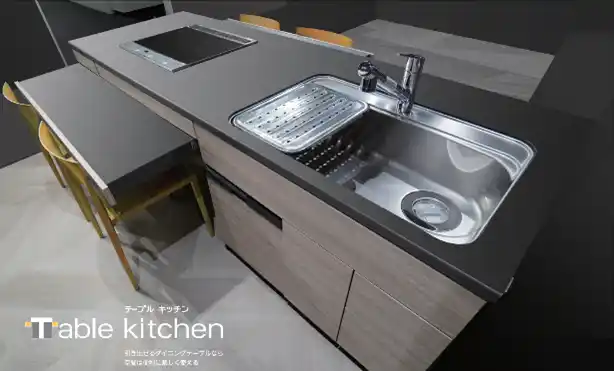 一部住戸には、当社グループの株式会社長谷工ファニシングが開発した「テーブルキッチン」を採用しました。「キッチンで囲む新たな食卓」という発想のもと、キッチンとテーブルを一体化し、対面型のスライドテーブルによって、調理から食事、片付けまでをスムーズに行えるレイアウトとしています。使う時だけ引き出せるスライドテーブルは、配膳や簡単な食事、作業台としても活用でき、住空間を有効に利用できます。キッチンを中心としたオープンスタイルにより、日常の中で自然と会話が生まれる、「楽で楽しい」住空間を実現しています。 |
