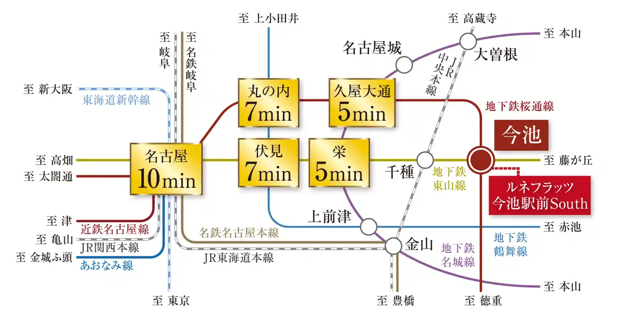 本物件は名古屋市営地下鉄東山線・桜通線「今池」駅徒歩4分の立地に誕生しました。「栄」駅・「伏見」駅、「久屋大通」駅・「丸の内」駅、そして「名古屋」駅まで10分圏内でアクセスできるため、通勤や休日のおでかけなど幅広いシーンで利用できるロケーションです。また、「今池」エリアは商店街や飲食店など生活利便施設が集積し、文化的な雰囲気も併せ持つ、日常の使い勝手と暮らしの豊かさを両立したエリアとして親しまれています。 |