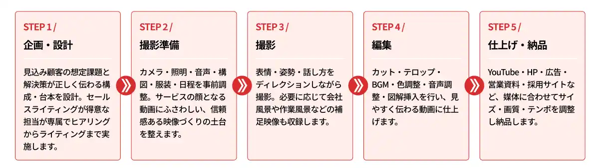 企画・設計からキックオフヒアリング、撮影、編集を経て、お申し込みから最短1ヶ月での納品を目指しています。まずはお気軽に無料相談からご連絡ください。 |