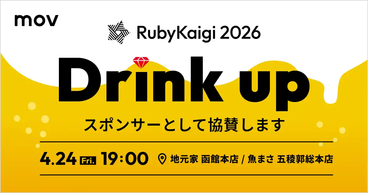 | インバウンド領域で複数事業を展開する株式会社mov(代表取締役:渡邊 誠、本社:東京都渋谷区、以下mov)は、2026年4月22日(水)から24日(金)に北海道函館市で開催される「RubyKaigi 2026」に、Drinkupスポンサーとして協賛・ブース出展することをお知らせいたします。 | ||||||||||