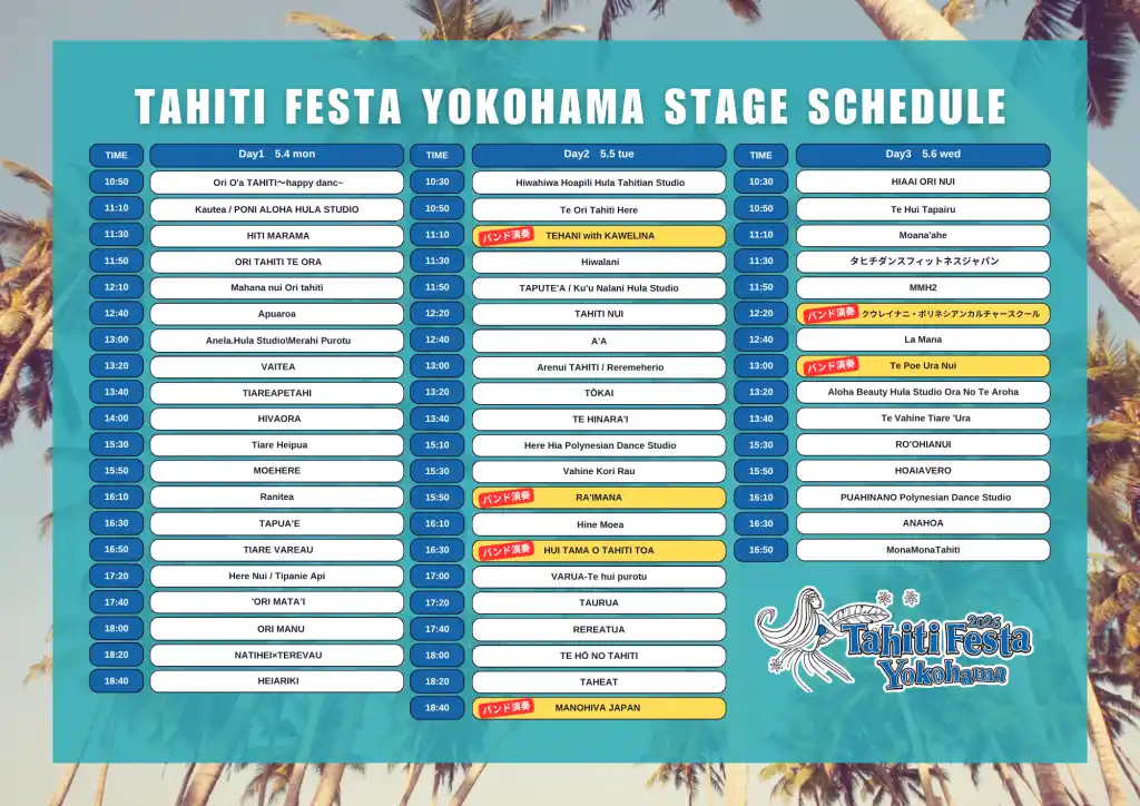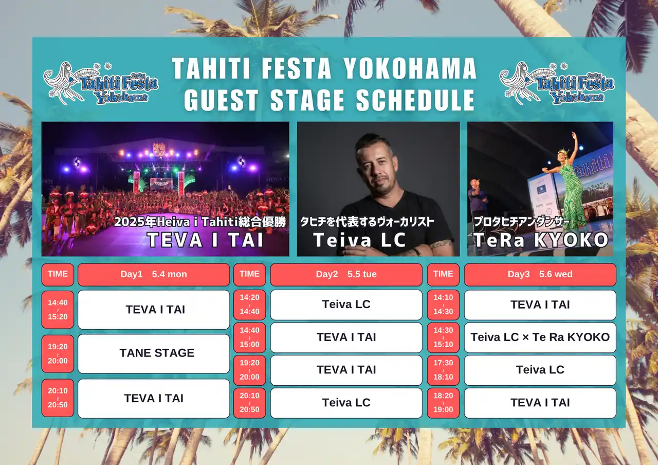 日本国内においてタヒチ全般のプロモーションを行っている株式会社タヒチプロモーション(代表取締役:大石 暢)は、2026年5月4日(月祝)~6日(水祝)の3日間「Tahiti Festa 2026 Yokohama」を開催します。2025年は3万人以上が来場し多くのお客様に楽園タヒチの文化・食・音楽・ダンスをお楽しみいただきました。今年はHeiva I Tahiti 2025総合優勝のタヒチNo.1のダンスグループTEVA I TAI(テヴァ イ タイ)のゲスト出演が決定!タヒチを代表するヴォーカリストのステージをはじめ、国内有数のタヒチアンダンスグループによる圧巻のステージ、現地から来日の職人による伝統工芸品からタヒチ直輸入商品の販売を行うなど、子どもから大人まで楽園タヒチの雰囲気を楽しめる入場無料のイベントです。 |