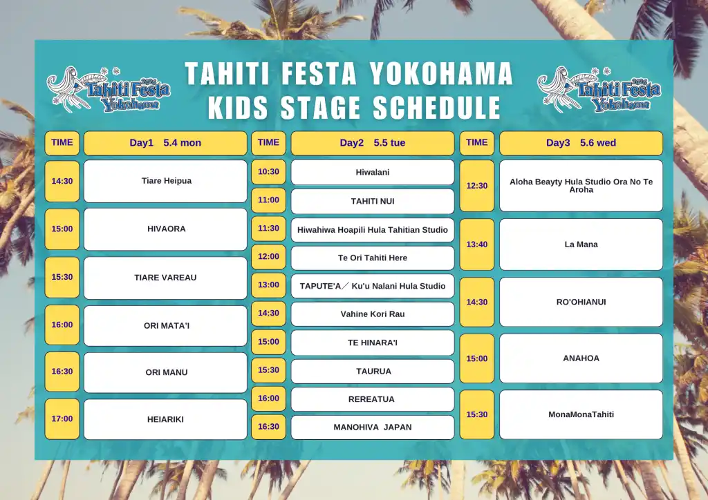 日本国内で活躍するタヒチアンダンスグループが迫力のステージをお届けします。関東を中心に昨年を超える「56組・約1300名を超えるタヒチアンダンサーが参加。昨年大好評の生演奏でのステージもパワーアップ!さらにエントランスのミニステージでは3日間キッズステージも開催決定!迫力溢れるステージをお楽しみいただけます。 |