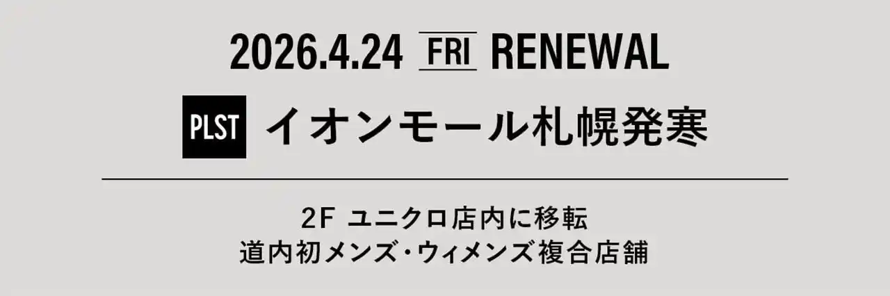ファーストリテイリンググループの、きちんとしていたい時の“毎日服”を提案するブランド「PLST(プラステ)」は、 4月24日(金)に「プラステ イオンモール札幌発寒店」を増床・移転オープンいたします。 |