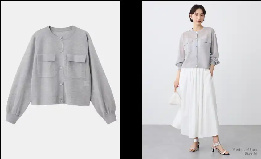 胸ポケット付きのジャケットライクなシアーカーディガン。 |