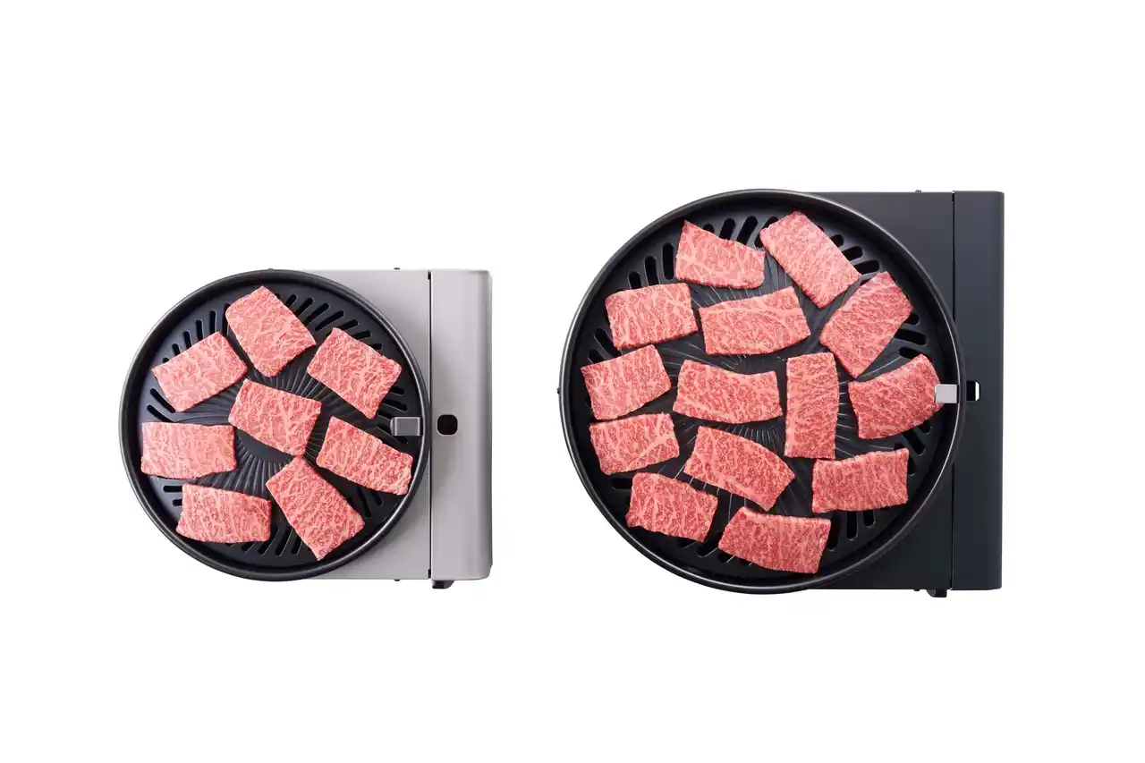従来品「カセットガス スモークレス焼肉グリル “やきまるII”」(左)と新商品「カセットガス スモークレス焼肉グリル “やきまるBIG”」(右)比較 |