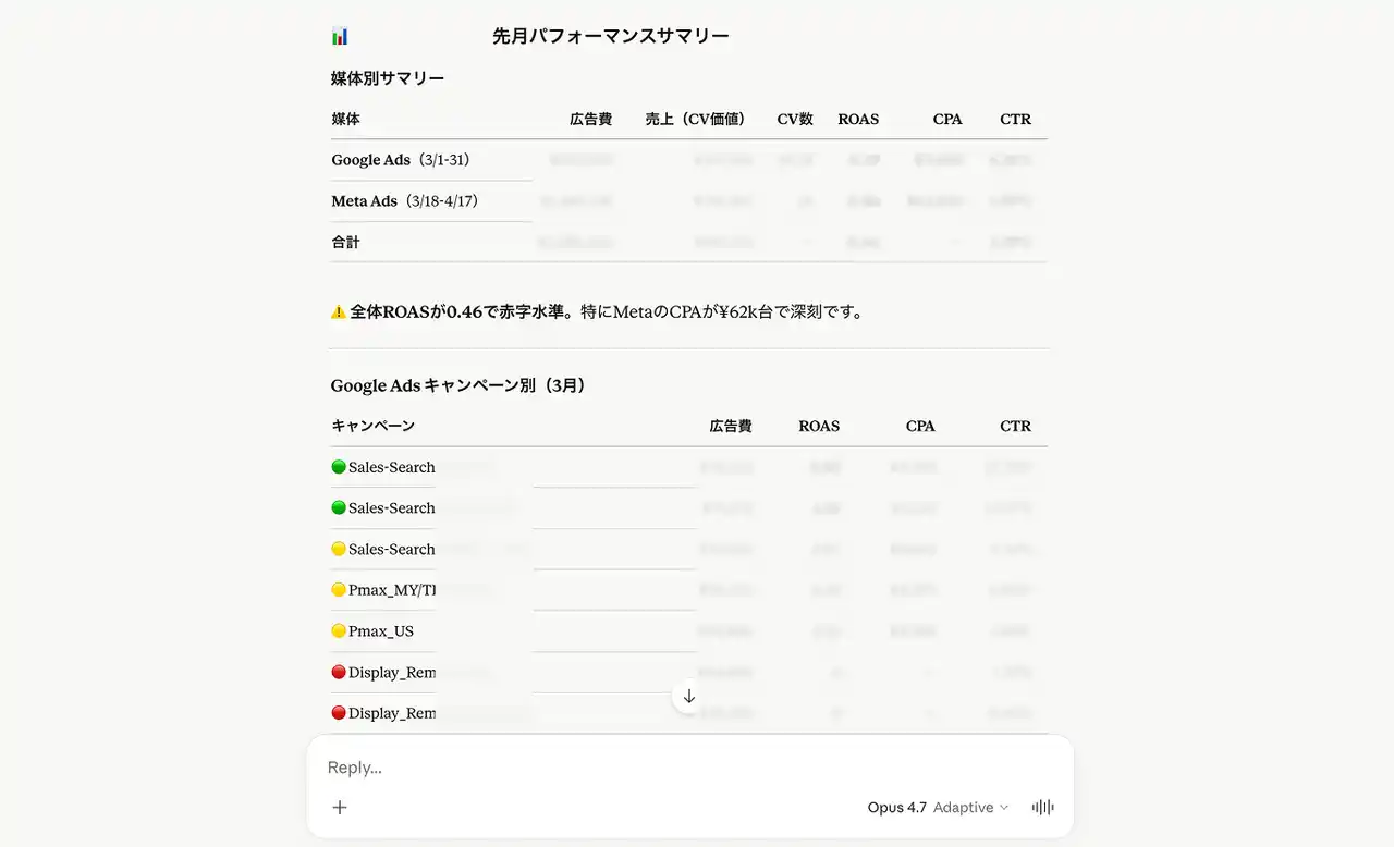 ClaudeがPresso経由でGoogle広告・Meta広告を横断集計し、先月のパフォーマンスサマリーと改善提案を自動生成した画面 |
