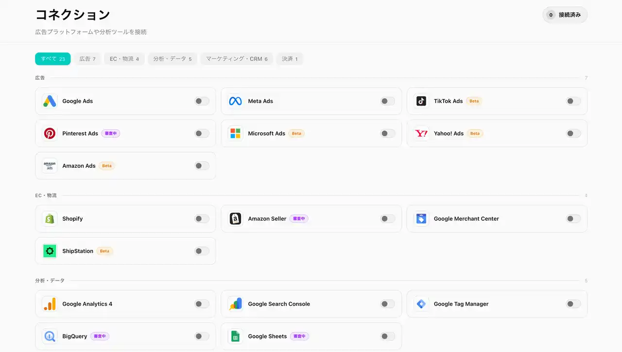 Google、Meta、TikTok、Microsoft、Pinterest、Yahoo!、Amazonの7媒体を1つのAIエージェントから統合管理。媒体横断のROAS / CPA / CPC比較、予算配分の最適化、新規キャンペーンの作成を単一インターフェースで実行します。 |