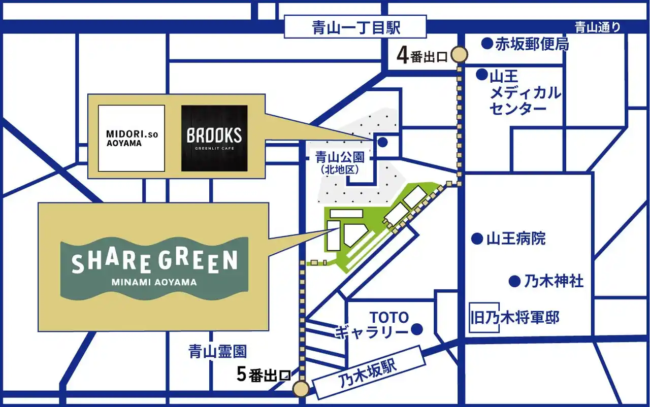 SHARE GREEN MINAMI AOYAMA (東京都港区南青山1丁目12-32) ※スタンプラリー実施の近隣店舗 MIDORI.so AOYAMA、BROOKS GREENLIT CAFE (東京都港区南青山1丁目7-12) |
