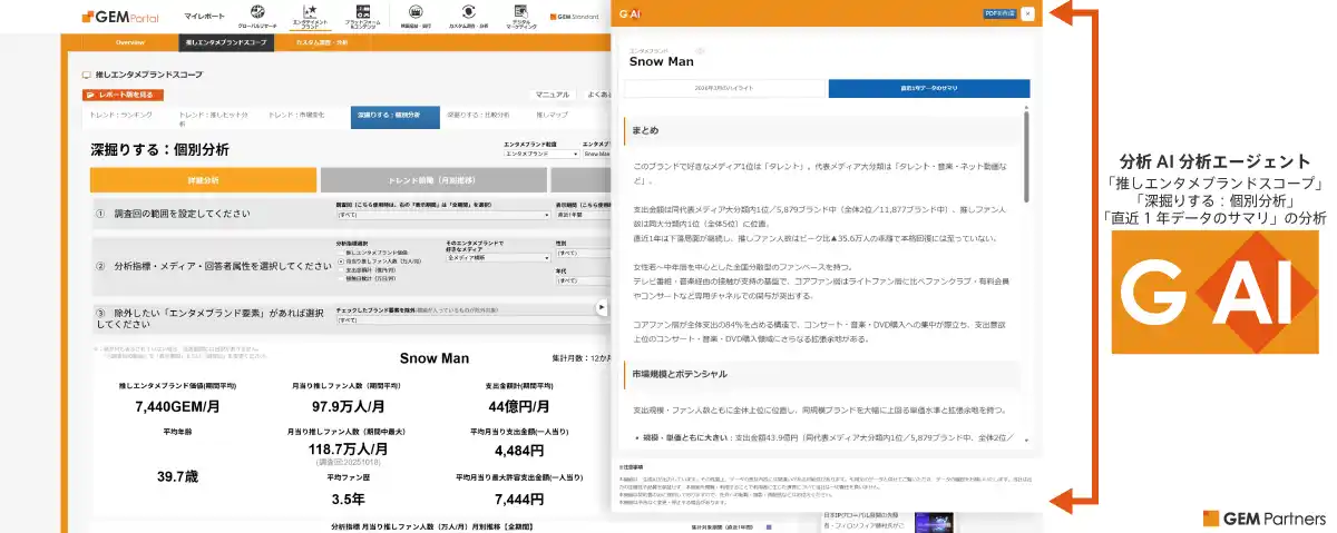 エンタテイメント業界に向けたデータ×デジタルマーケティングサービスを提供するGEM Partners株式会社(ジェムパートナーズ、所在地:東京都港区、代表取締役:梅津文)は4月17日(金)、推されているエンタメブランドとそのファンを理解し、次のヒットを見いだすオンラインダッシュボード「推しエンタメブランドスコープ」に、業界特化型の分析AIエージェント「GAI(ガイ)」を導入いたします。「GAI」は、膨大な推しファンデータの動向を自動で分析してサマライズ。これまで手作業で行っていた分析工数を大幅に削減し、より高度な戦略立案への注力を可能にします。 |