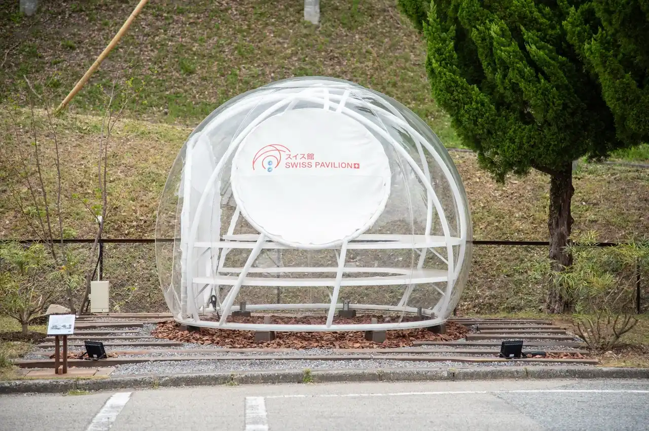 大阪・関西万博のスイス館は、複数の球体が重なり合う印象的な建築です。球体は、合成樹脂とポリ塩化ビニールの2種類の膜を重ねた二層構造で、空気でふくらませることで形を保ちます。その軽量性から、スイスがこれまでの国際博覧会で建設したパビリオンの中でも最軽量の建物となりました。また球体は、人や自然のつながりを象徴し、二酸化炭素排出量の削減にも配慮した、持続可能な未来を体現するデザインです。 |