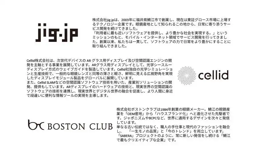 株式会社jig.jp(本社:福井県鯖江市、東証グロース市場:5244、以下「当社」)は、当社が開発を進めるスマート眼鏡(ARグラス)事業において、ARグラスブランド「SABERA(サベラ)」に関するメディア向け新製品発表会を開催し、ブランドおよびプロトタイプの初披露を行いました。 |