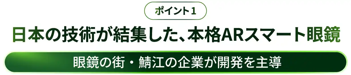 国内唯一のAR光学技術、鯖江のデザイン設計力、そしてソフトウェア・UX設計。各分野で培われた技術を融合することで、日常利用を前提とした“正統派ARグラス”が誕生しました。日本独自の緻密な設計と厳しい品質管理により、圧倒的な完成度を実現しております。 |