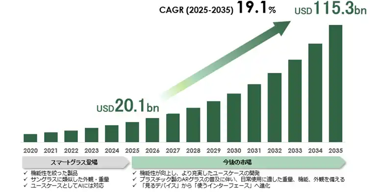 Ray-Ban Meta をはじめとするスマートグラスの普及を契機に、眼鏡型デバイス市場は世界的に普及フェーズが急速に進展し、2026年以降はARグラス市場の本格的な拡大が見込まれています。Future Market Insights社の調査によると、ARグラス市場は2025年から2035年にかけて年平均成長率19.1%で拡大し、2035年には市場規模1,153億米ドルへ拡大するとの予測が示されており、情報取得の主要インターフェースがスマートフォンから眼鏡型デバイスへ移行する転換点にあると考えます。 |