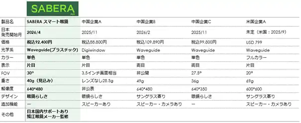 一般消費者向けARグラスは、海外メーカーを中心に製品展開が進んでおります。一方で、国内における同市場は未成熟であり、当社が先行する形で市場参入を行っています。各社製品においては、用途や設計思想に違いが見られる中、SABERAは日常利用を前提とした設計思想のもと、光学技術・装着性・UX設計のバランスを重視したプロダクトとして開発を進めています。 |