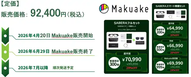 SABERAは、まずはクラウドファンディングサービス「Makuake」にて先行販売を予定しています。その後、2026年7月以降、自社ECサイトおよび販売代理店を中心に本格販売を予定しています。 |