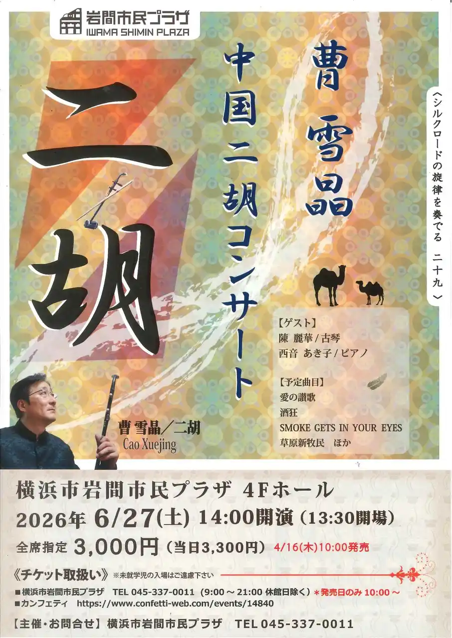 今回は、二胡奏者の曹雪晶と陳麗華の古琴、西音あき子のピアノ共演でお贈りします! |
