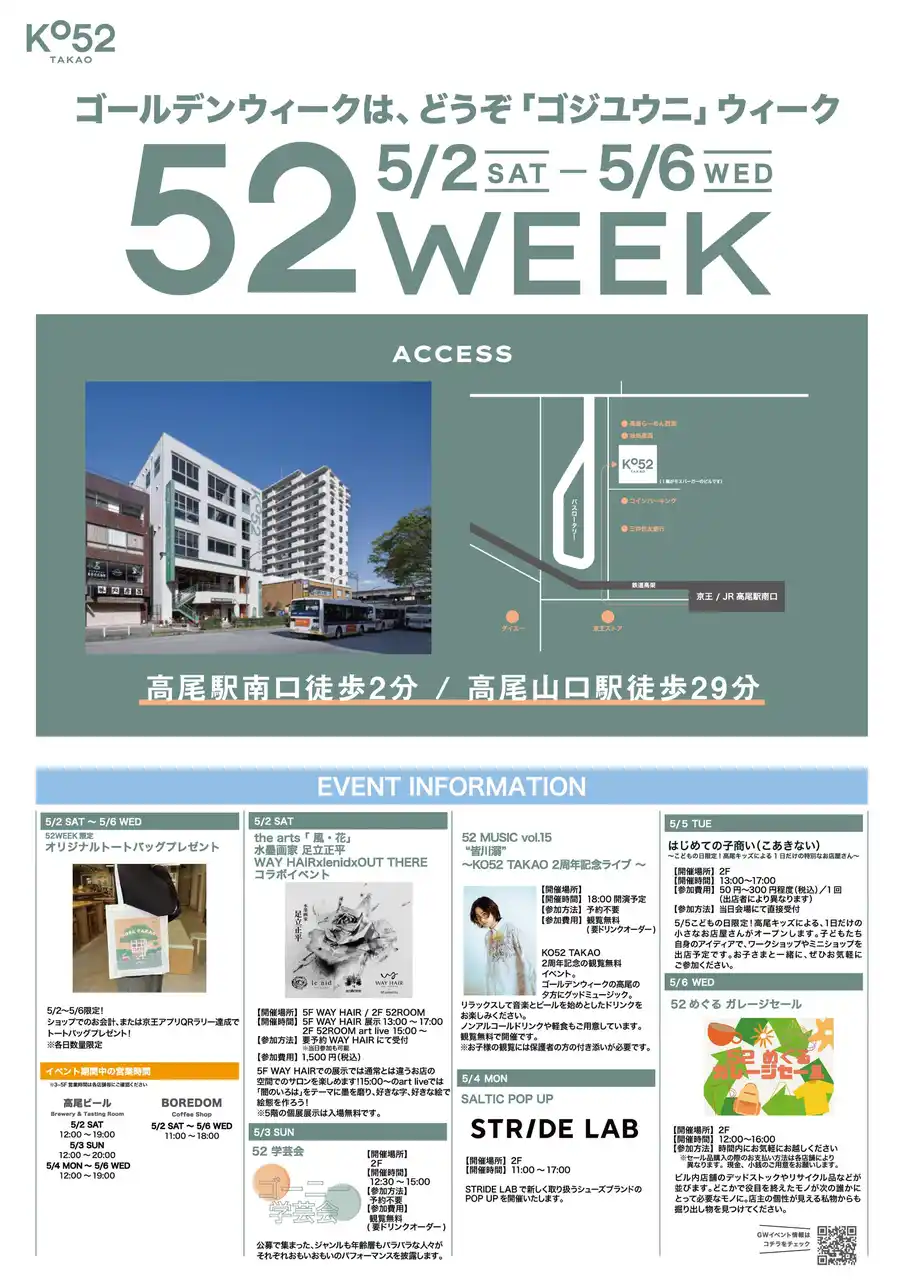 | 株式会社京王SCクリエイション(本社:東京都渋谷区、代表取締役社長:小堺 健司)は、京王高尾線高尾駅前にある商業施設「KO52 TAKAO(以下、本施設)」において、5月2日(土)~5月6日(水)の期間で、「52WEEK(以下、本イベント)」を開催します。 | ||||||||||||||||||