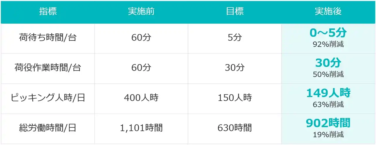 仕分工程の自動化により、荷待ち時間を92%削減。19時発の特別便を完全廃止し、18時の最終便で当日全集荷を完了する体制を実現しました。 |