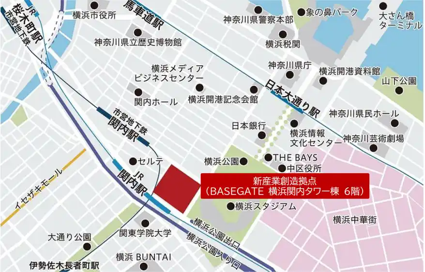 その舞台となる本拠点は、関内駅前、横浜スタジアム直結のアクセスに加え、オフィス・商業・ホテルが一体となった「BASEGATE横浜関内」のタワー棟6階に位置し、最先端の賃貸ウェットラボやオフィス、交流ラウンジ、イベントスペースを備えます。 |