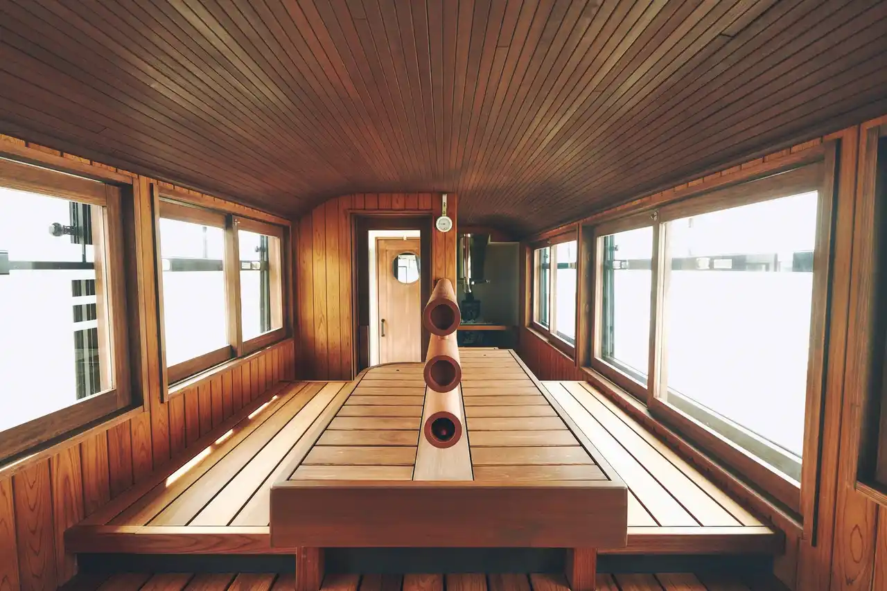 ■サバス4号車は「うなぎ」がテーマのご当地サバス サバス4号車のコンセプトは、浜松の名産「うなぎ」です。サウナ室は、町家の細長い構造を指す「うなぎの寝床」をモチーフに採用しました。奥行きのある細長い空間設計は、座ると自然と視線が窓へと導かれるよう設計しています。 これにより、利用者同士の視線が気になりにくく、落ち着いた空間体験を生み出します。空間だけでなく、ロウリュの演出や香りなど、五感を通してうなぎの世界観を感じられる体験も準備中です。 |