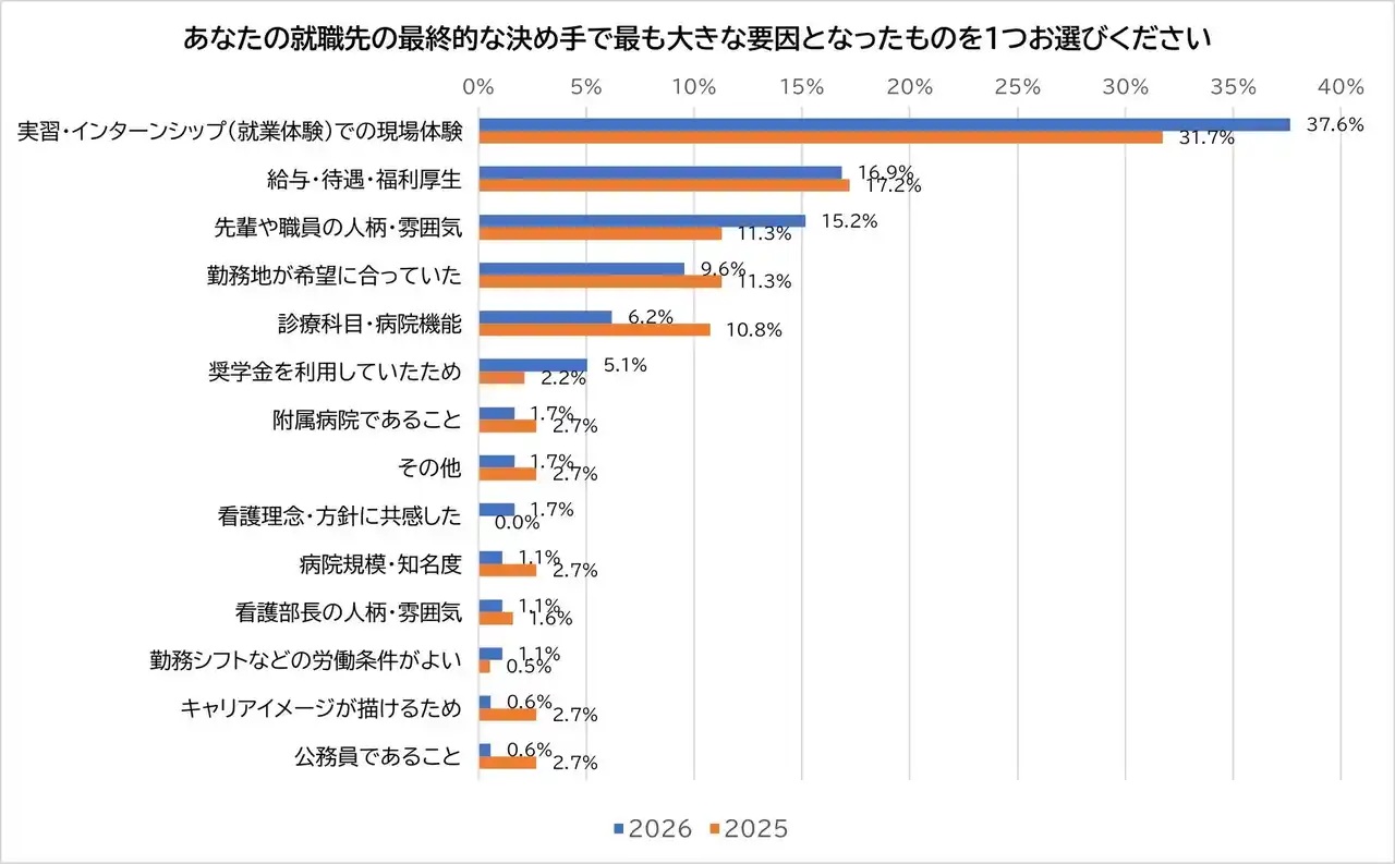 就職先の決め手は、「実習・インターンシップ(就業体験)での現場体験」が昨年比5.9ptアップで首位に。26卒で大きくポイントがアップしたのは「先輩や職員の人柄・雰囲気」で、3.9ptアップ。現場の職場体験の感覚をもとに、良い人間関係のなかで日々心地よく働けるかどうかが決め手となっている(※前述の、「就活時に本当に知りたかった病院情報」の結果も同様)。 |