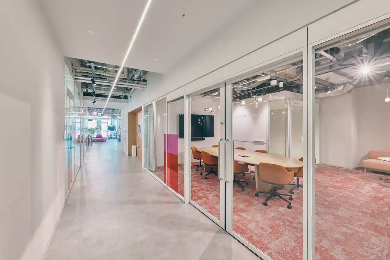 Stellar Hallway³: 「イノベーションは廊下の雑談から生まれる」という思想を具現化した空間。通路に簡易デスクやスタンディングスペースを点在させることで、予定調和ではない対話を日常の動線の中に促します。 |