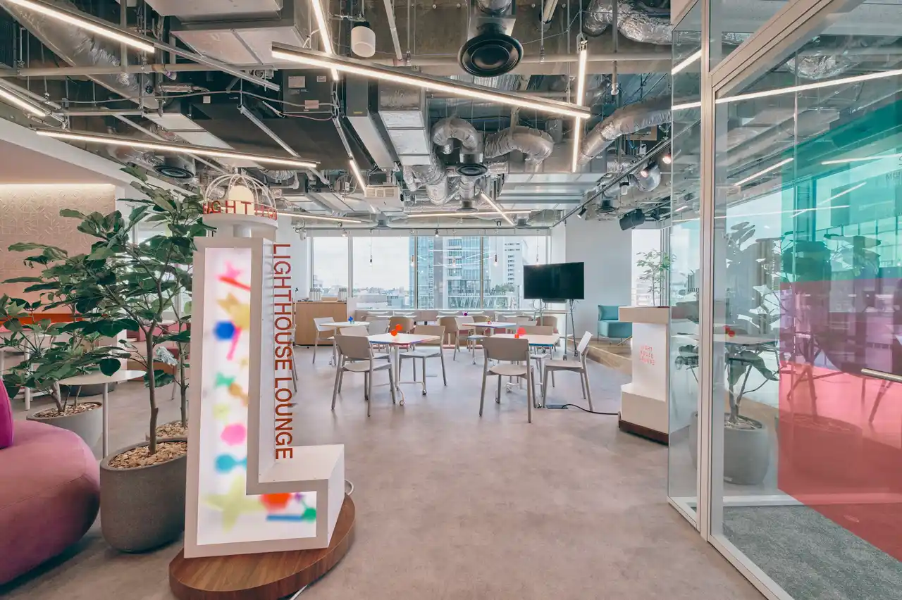 Lighthouse Lounge²:イベント・プレゼンテーション・会議などの各機能をシームレスに統合したハブ空間。カフェエリアを中心とした開放的なしつらえが、偶発的かつ創造的なコミュニケーションを促します。 |