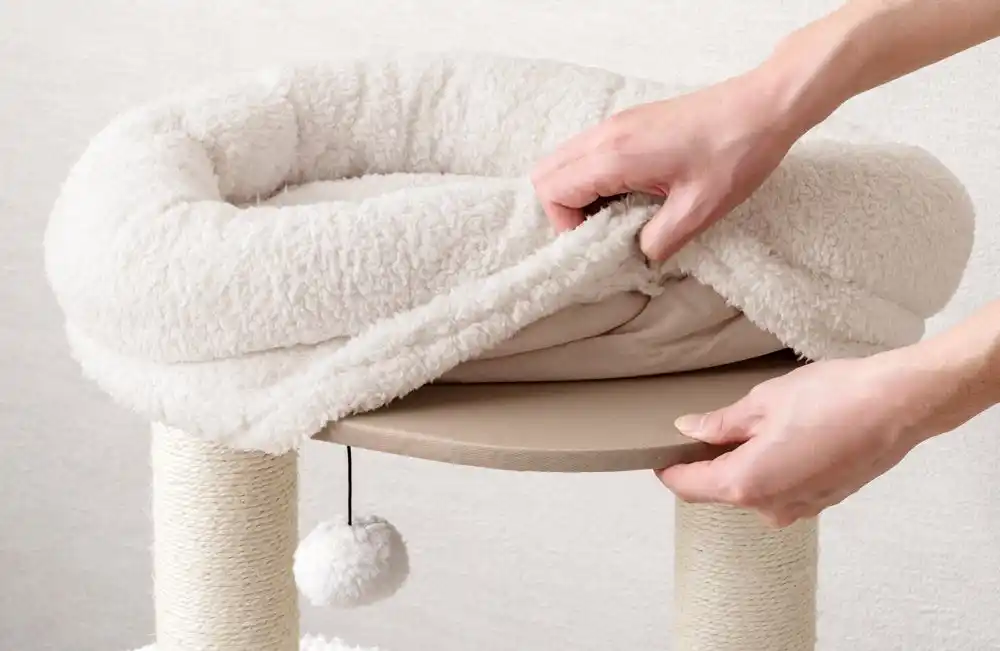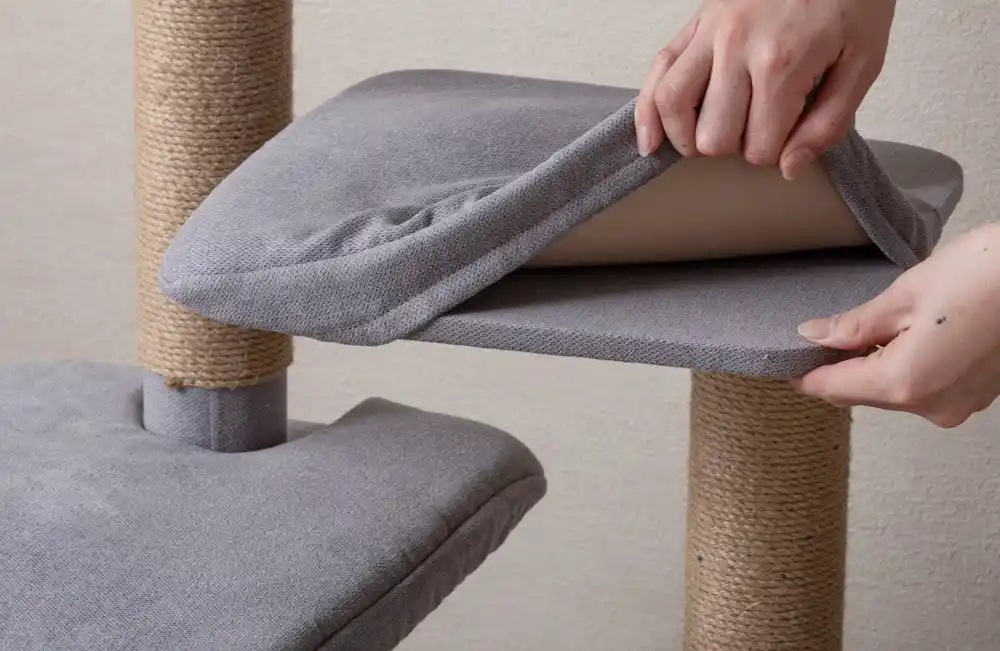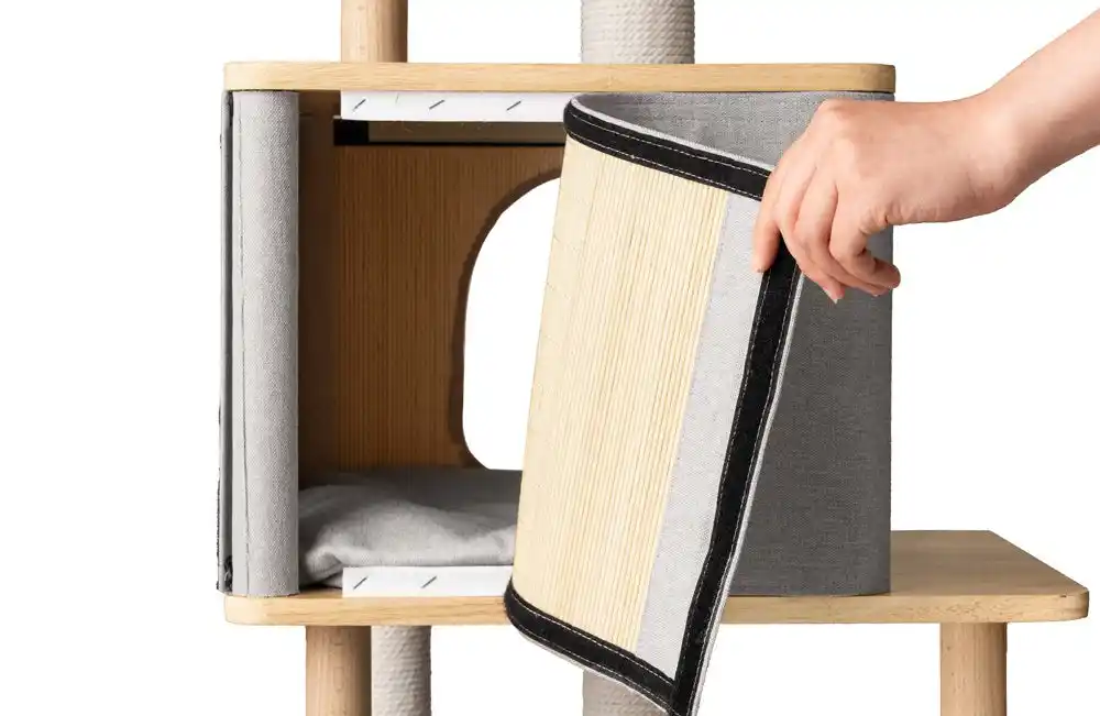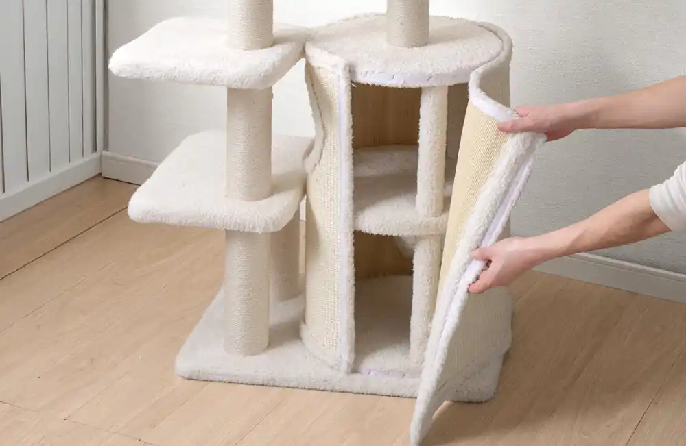 爪とぎは支柱だけでなく、ハウスの外壁部分でも行える多機能設計となっており、思う存分爪とぎをしてもらうことができます。最上段に設けたふっくらとしたベッドも取り外して丸洗いが可能なため、衛生面を気にせず長くご愛用いただけます。 |