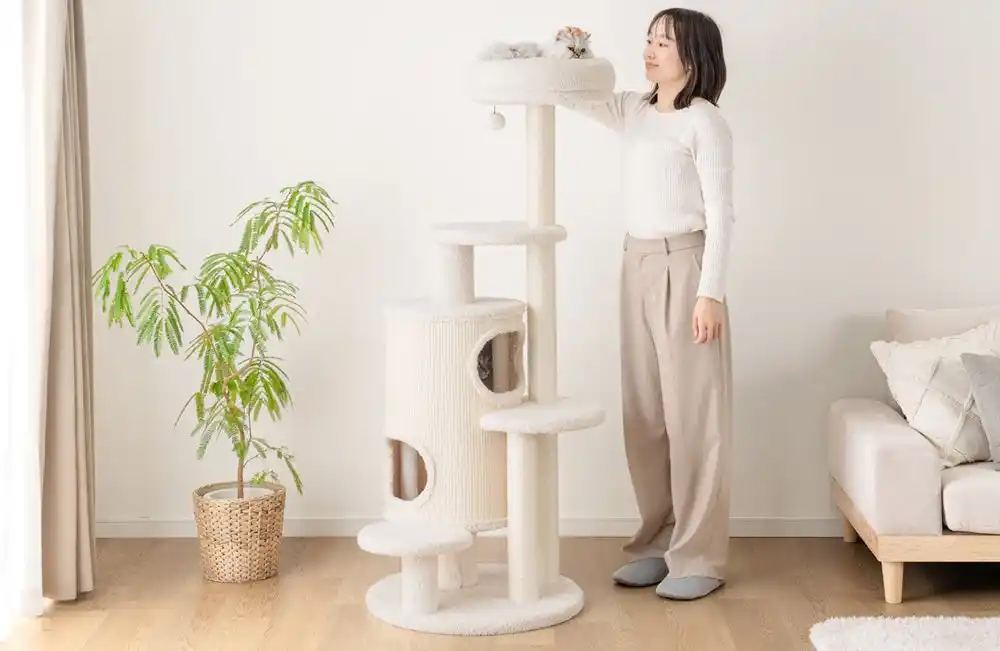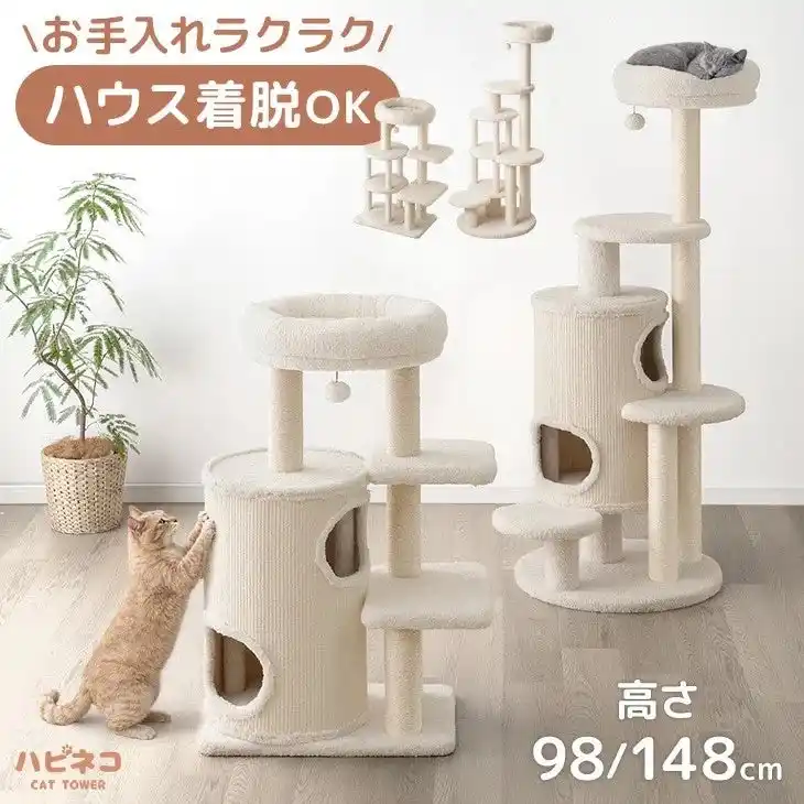 足腰の弱い子猫やシニア猫でも上り下りしやすい「高さ98cm」と、活発な猫が思いっきり遊べる「高さ148cm」の2タイプを展開。愛猫の成長段階や、お部屋のスペースに合わせて最適なモデルを選択可能です。 |