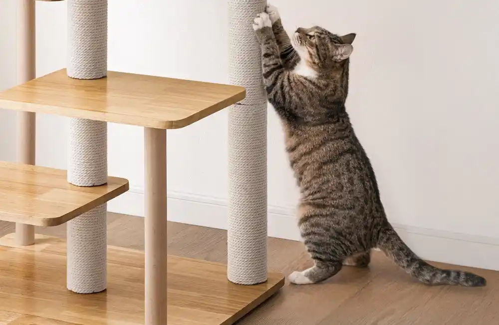 最下段の爪とぎポールには、愛猫が体をこすりつけて毛繕いを行える「すりすりポール」を設け、猫がいつでも心地よく過ごせる工夫を凝らしました。 |