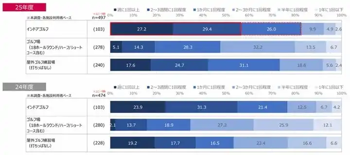 また、特に30代・40代において利用頻度の伸びが顕著であり、インドアゴルフ が現代ゴルファーの主要な練習環境となりつつあることがうかがえます。 |