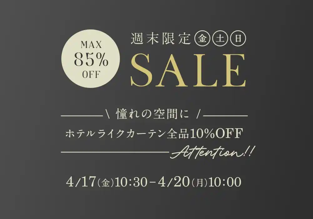 内容:最大85%OFF、ホテルライクカーテン10%OFF、新商品10%OFF |