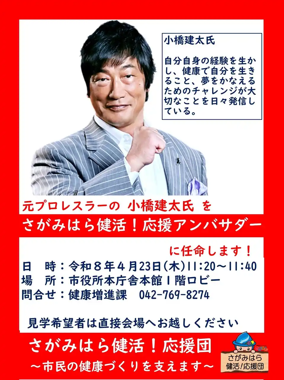 神奈川県相模原市は、相模原市健康づくり推進条例に基づく施策をより一層推進するため、市・市民・関係者が一体となり、「さがみはら健活 !応援団」として、市民の健康づくりを応援します。市民の健康づくりに対する気運の醸成や、市民が自らの心身の状態に応じた健康づくりに取り組むことを促進するため、広報大使として、「さがみはら健活 !応援アンバサダー」を設置。その第1号として小橋 建太氏を任命し、4月23日(木)には同氏の任命式を行います。 |
