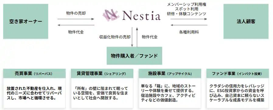 Nestiaは、そうした空き家の価値を見つめ直し、再生し、社会の中で再び循環させていくことで、新たな価値を創出していきます。Integrityの不動産投資・運用の知見と、クラダシ社のブランド力・ネットワーク力を掛け合わせ、社会的価値と経済的価値の両立する事業を育ててまいります。空き家の再生を通じて、地域に新しい豊かさと可能性を生み出し、次の時代に必要とされる社会資産のあり方を形にしていきたいと考えています。」 |