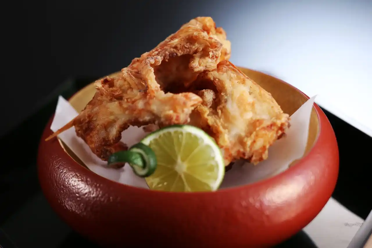 身が締まった但馬とらふぐの唐揚げはカリっとし、滋味深い味わいです。 |