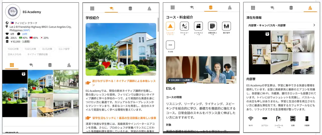 ネイティブキャンプ留学では、ユーザーが必要な情報を分かりやすく把握できるよう、常に丁寧で明確な情報提供を心がけています。EG Academyの詳細情報は、以下の4つのカテゴリーに分けて掲載しており、知りたい情報を的確にお届けします。 |