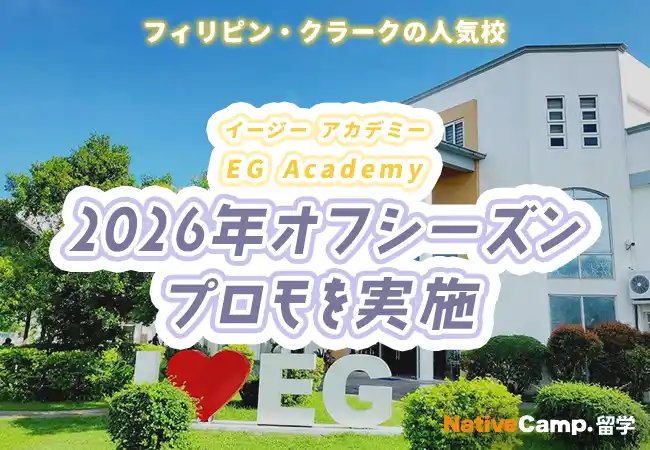 ネイティブスピーカーと回数無制限のオンライン英会話サービス「ネイティブキャンプ英会話」を展開する株式会社ネイティブキャンプ(東京都渋谷区 代表取締役:谷川国洋)は、海外留学エージェントサービス「ネイティブキャンプ留学」において、フィリピン・クラークの語学学校「EG Academy」にて、2026年オフシーズンプロモーションを実施いたします。 |