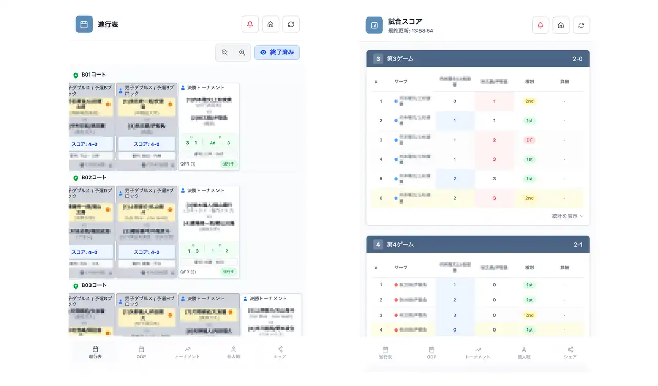 これらの変更は、選手や観客がスマホで確認できる「ゲストサイト」にもリアルタイムで反映されました。会場にいる全員が「どの試合がどのコートに移動したか」を即座に把握できる環境を整え、悪天候の中でも混乱のない大会運営を実現しました。 |