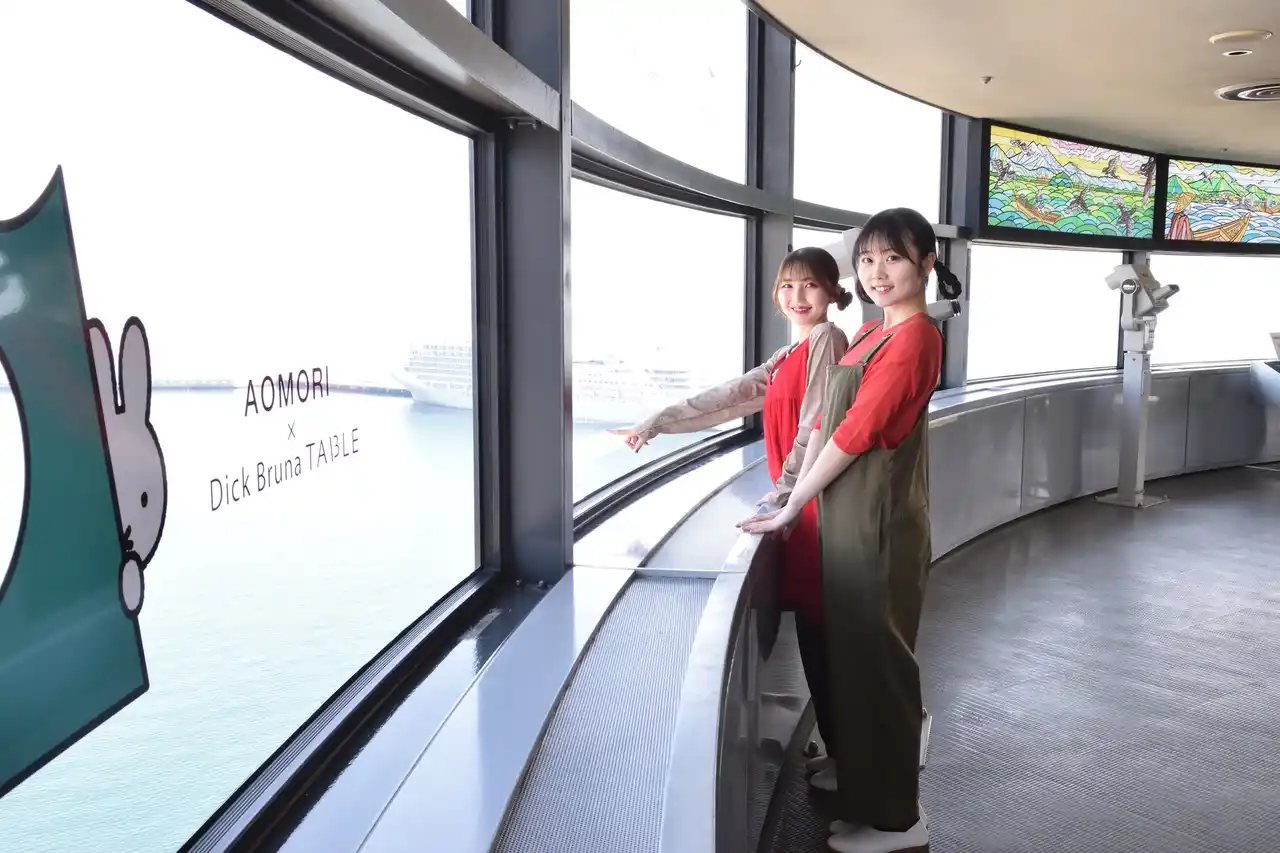 展望台にはミッフィーのフォトスポットが4ヵ所出現し、青森の景色とともにその姿を見ることができます。青森の海にミッフィーが浮かんでいるかのような姿にりんご娘さんたちに思わず笑みがこぼれます。さらに隣接する青い海公園にはミッフィーのお顔が!見つけた瞬間、「わあーーーー!!」と驚きの声が上がりました。 |