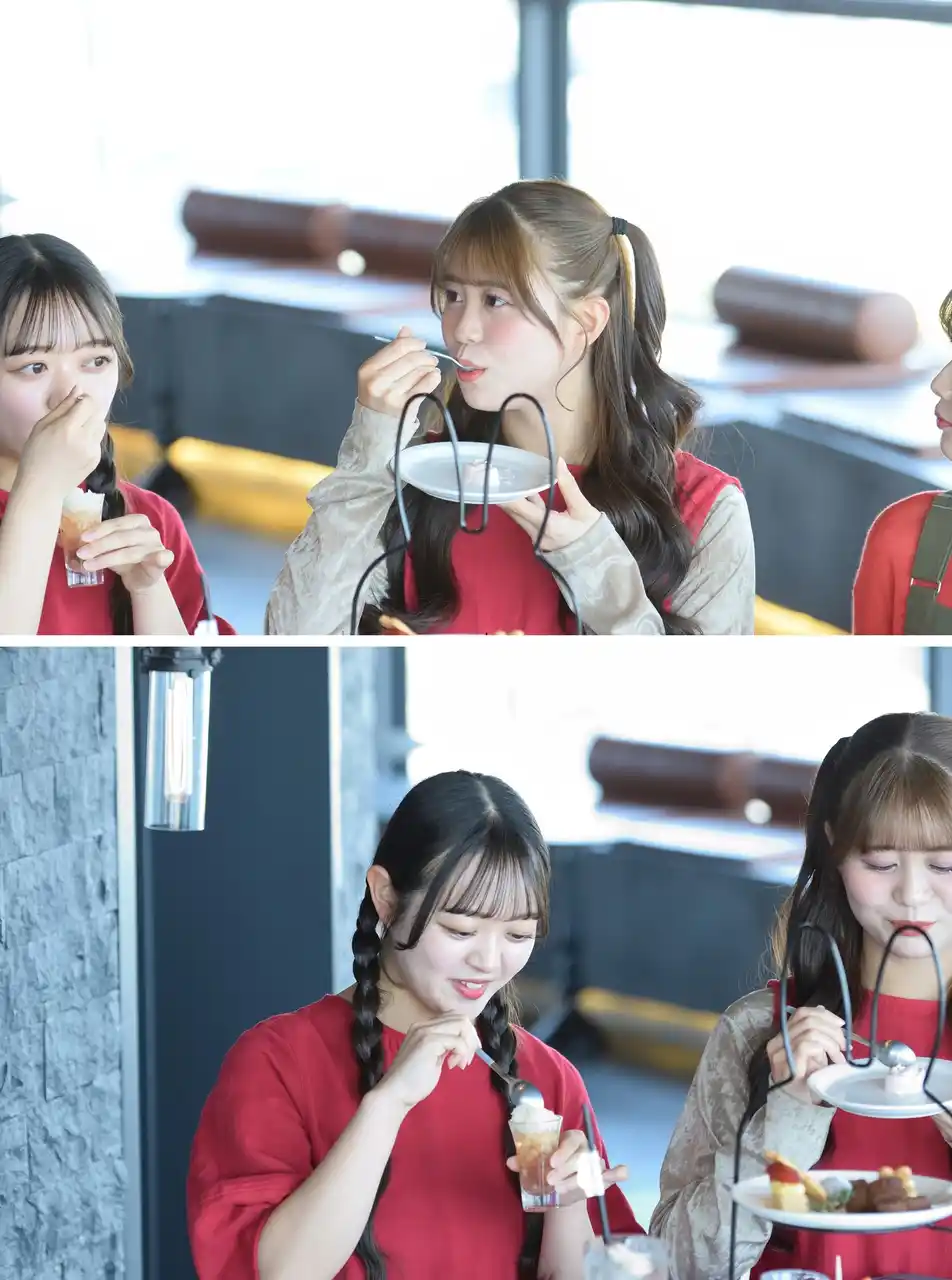 「うみとひかり」(青森県観光物産館アスパム 14F)にて、本イベントで提供されるコラボフードの中から、アフタヌーンティーをりんご娘さんが試食。青森県産のリンゴを使用したアップルパイや、Bean to Bar RAWチョコレートを使用したチョコレート菓子、春らしいいちごのチーズケーキ、りんごのジュレを楽しまれました。「とにかくかわいい!食べるのがもったいない」「おしゃれで写真を撮りたくなります!」と、まずは見た目のかわいさに歓声が上がりました。「りんごの甘さがやさしくてしあわせな味」「小さなお子さんから大人まで、みんなで楽しめそう」と試食したメニューの感想に会話が弾み、喜びいっぱいのご様子でした。 |