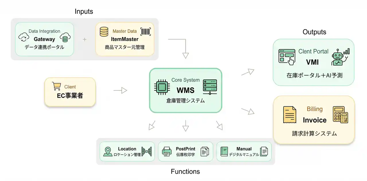 EC事業者にしかわからない物流課題を解決するために統合型倉庫管理システム(WMS)「フレンズロジWMS」を独自開発。 岐阜という日本の物流の中核地点である立地を強みとし、岐阜県海津市の旧西江小学校(2024年3月閉校)を活用することで競争力ある価格を実現。 |