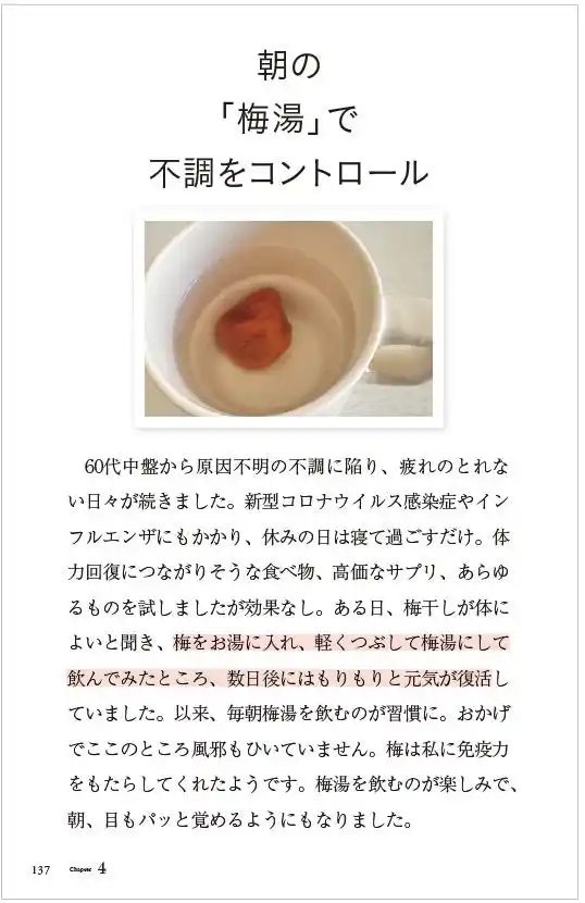 本書では、気になるボディケアやインナーケアもたっぷり紹介。「60代に入って、体調がすぐれず、疲れが取れない時期があったんです。疲労回復のためにサプリなどもいろいろ試したなかで、断然効果があったのが朝の梅湯。梅干しを軽くつぶしてお湯に入れて飲むだけなのですが、風邪を全くひかなくなりました」。 |