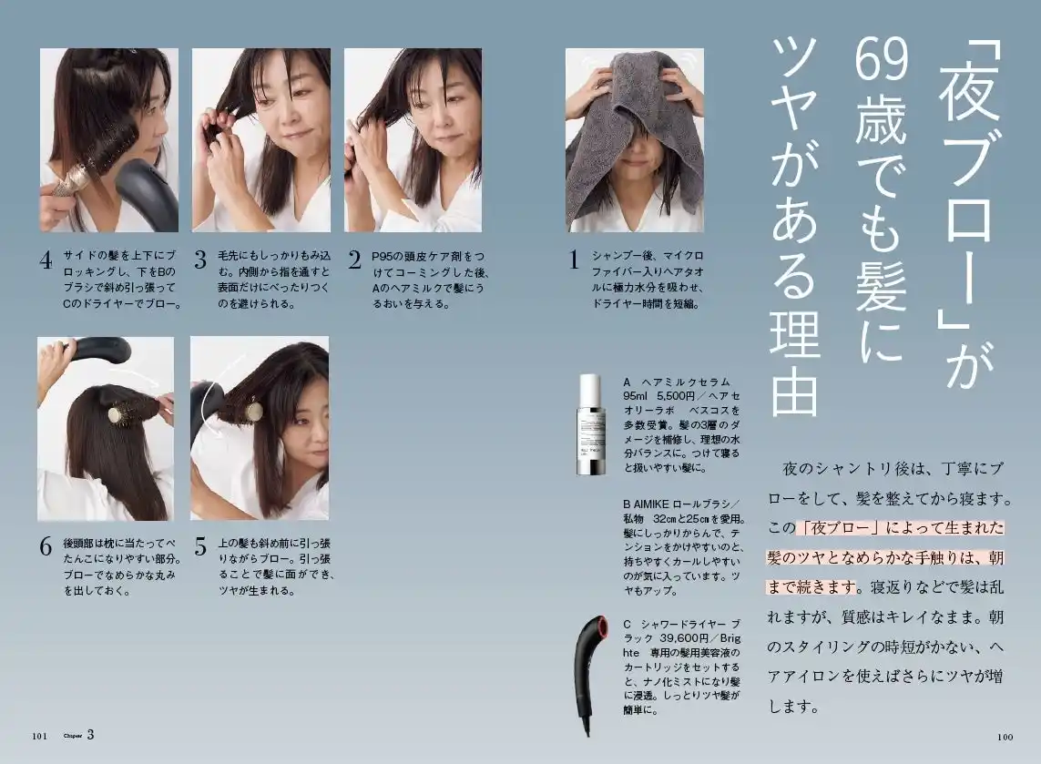 「大人が髪の手入れを怠ると、うねりやアホ毛が出て、どうしても老けた印象に。私が欠かさないのは『夜ブロー』。夜も朝並みに丁寧にブローし、ツヤを出して形を整えておきます。これで朝のスタイリングの仕上がりが全く違います」。 |